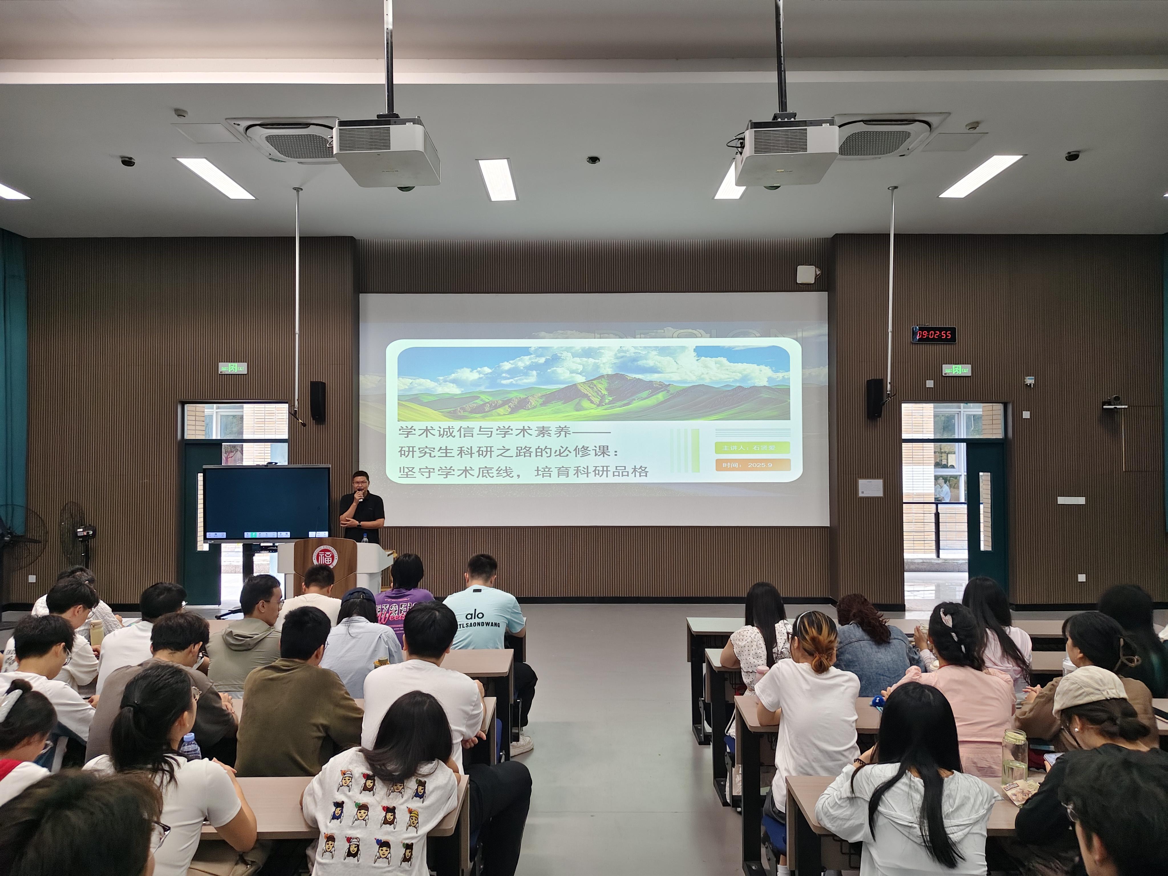 为弘扬科学精神,筑牢学术诚信基石,9月11日早上,石贤爱副院长在旗山校区东3-100为研究生新生开展了“坚守学术底线,培育科研品格”为题的科学道德与学术诚信教育讲座。石院长从学术道德的核心内涵与时代要求、学术不端的类型与典型案例、研究生全流程学术规范等,多方面的剖析了学术不端行为的危害,强调了遵守学术规范、恪守科研伦理是每一位科研工作者的基本准则,石院长希望广大研究生新生从入门伊始就树立崇高的学术理想,培养严谨求实的科学态度。