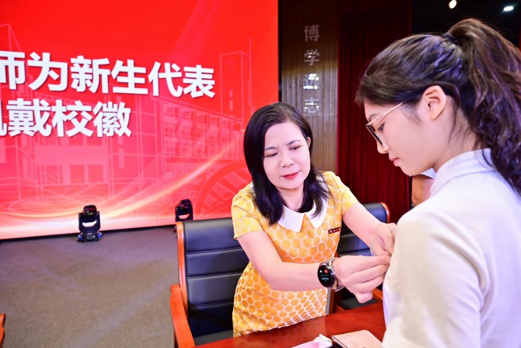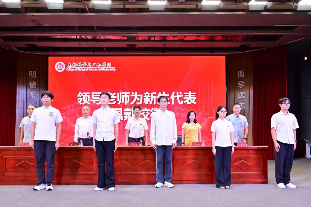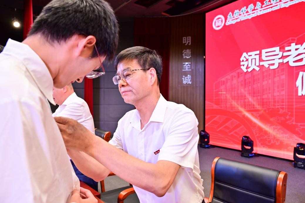 领导与会老师亲自为2025级本科及研究生新生代表佩戴校徽并合影留念。这枚校徽不仅是“福大人”身份的象征,更寓意着全体2025级新生正式融入生工大家庭,肩负起生工学子的责任与使命。