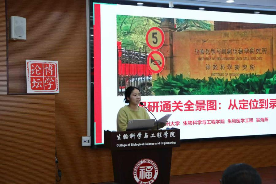吴海燕学姐结合自身面试经历,详细介绍了相关院校的考核难度、竞争强度、面试氛围以及资源条件,并介绍了保研最看重的条件:学业成绩、科研经历、英语水平等。她表示,英语竞赛可以为简历增色,而稳定的绩点是敲开目标院校大门必备的钥匙。她的经验分享让在场的同学对保研有了更直观的认知。