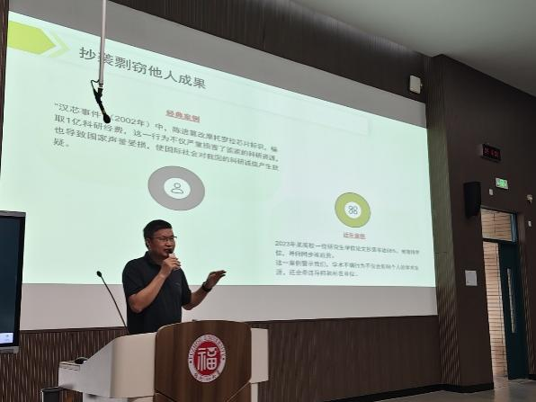 为进一步强化教育效果,副院长石贤爱教授为2025级研究生新生作了题为《坚守学术底线,培育科研品格》的科学道德与学术诚信专题讲座。讲座从学术道德的内涵与基本要求、典型案例剖析、以及科研全流程的学术规范等方面,深入阐述了学术不端行为的严重危害,并着重强调遵守学术规范、恪守科研伦理是每一位科研工作者必须坚守的基本准则。