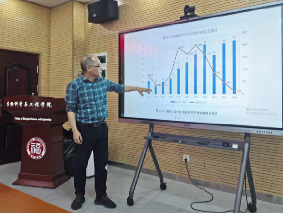 詹庆东副馆长作了“ESI潜力分析与提升策略”专题报告,从论文产出、被引表现、期刊投稿、国际合作等方面提出提升策略。他指出,学校已有化学、工程学、材料科学3个学科跻身ESI全球前千分之一,农业科学是下一阶段重点培育方向。