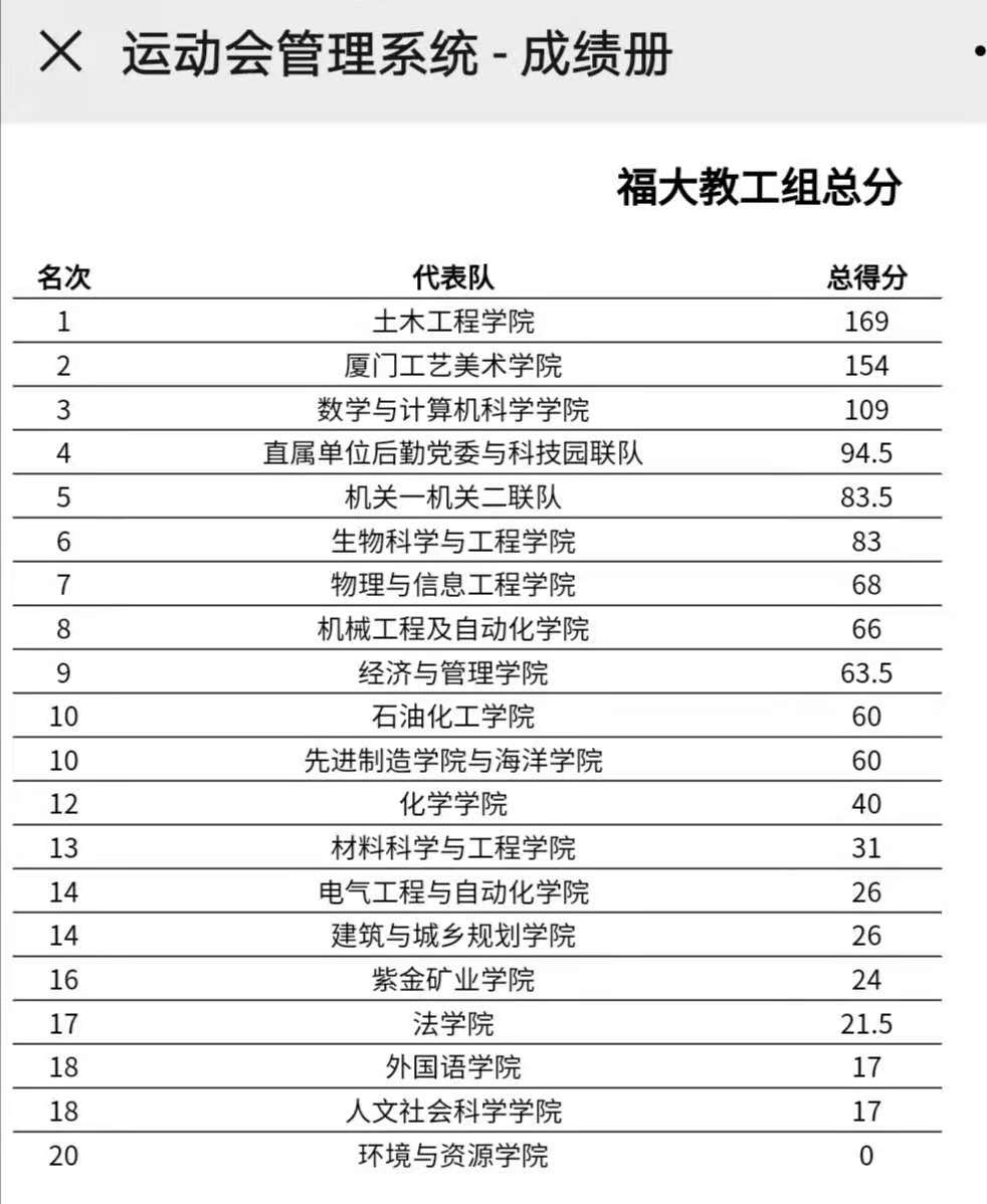 教工代表队在全校20个参赛队伍中,取得了团体总分第六名的好成绩,并会同学生一起获得了体育道德风尚奖。